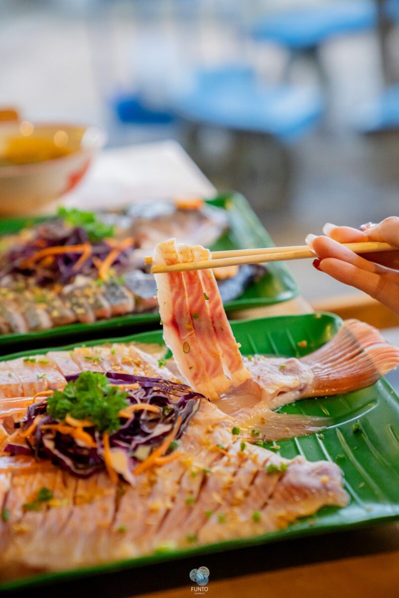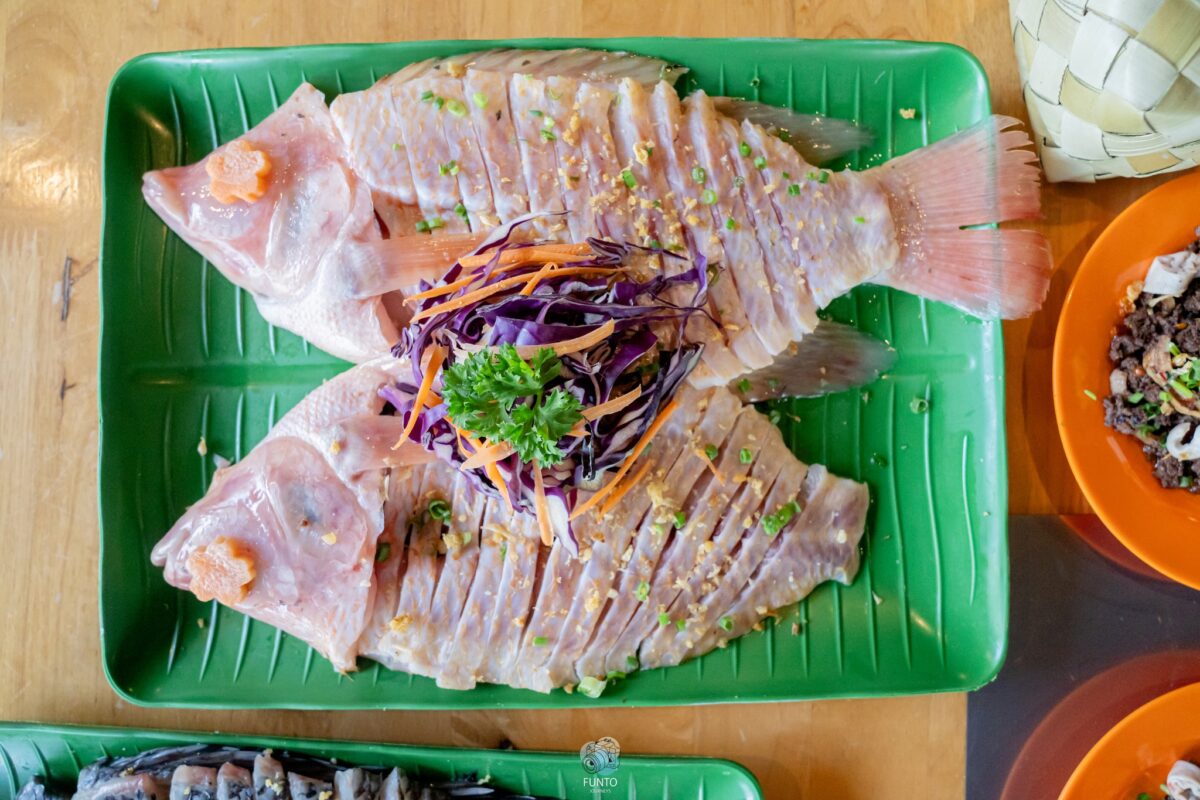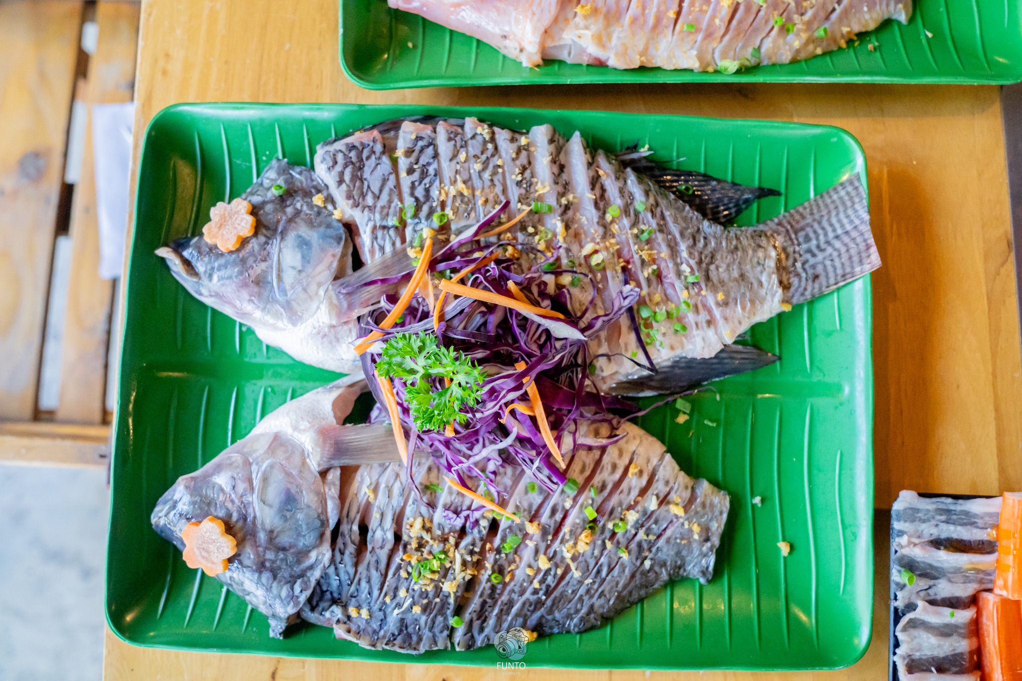 ปลาของเค้าบอกเลยว่าสด สะอาด เนื้อแน่นมาก ไม่คาวเลย เสิร์ฟมาแบบทั้งตัว ปลาคือตัวไม่เล็กน้า มีทั้งปลานิล ปลาทับทิม ปลาคัง ปลากระพง ราคาเริ่มต้นที่ 179-229 บาท