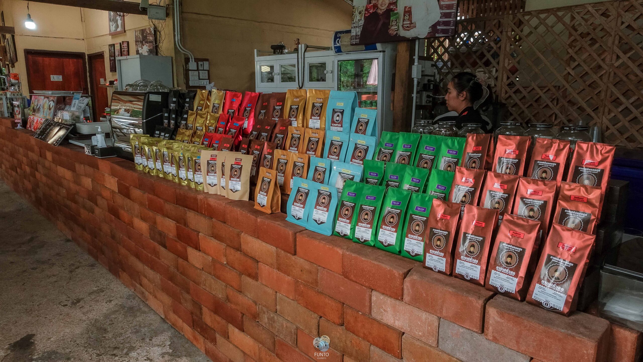 ที่นี้เค้าจะคั่วเมล็ดกาแฟเอง และมีเมล็ดกาแฟคั่วสดจำหน่ายด้วย นอกจากนี้ก็มีแก้วงานเลเซอร์ และของฝากอื่นๆ ที่สำคัญราคาไม่แพง กาแฟม้งดอยปุย Hmong Doi Pui Family Coffee