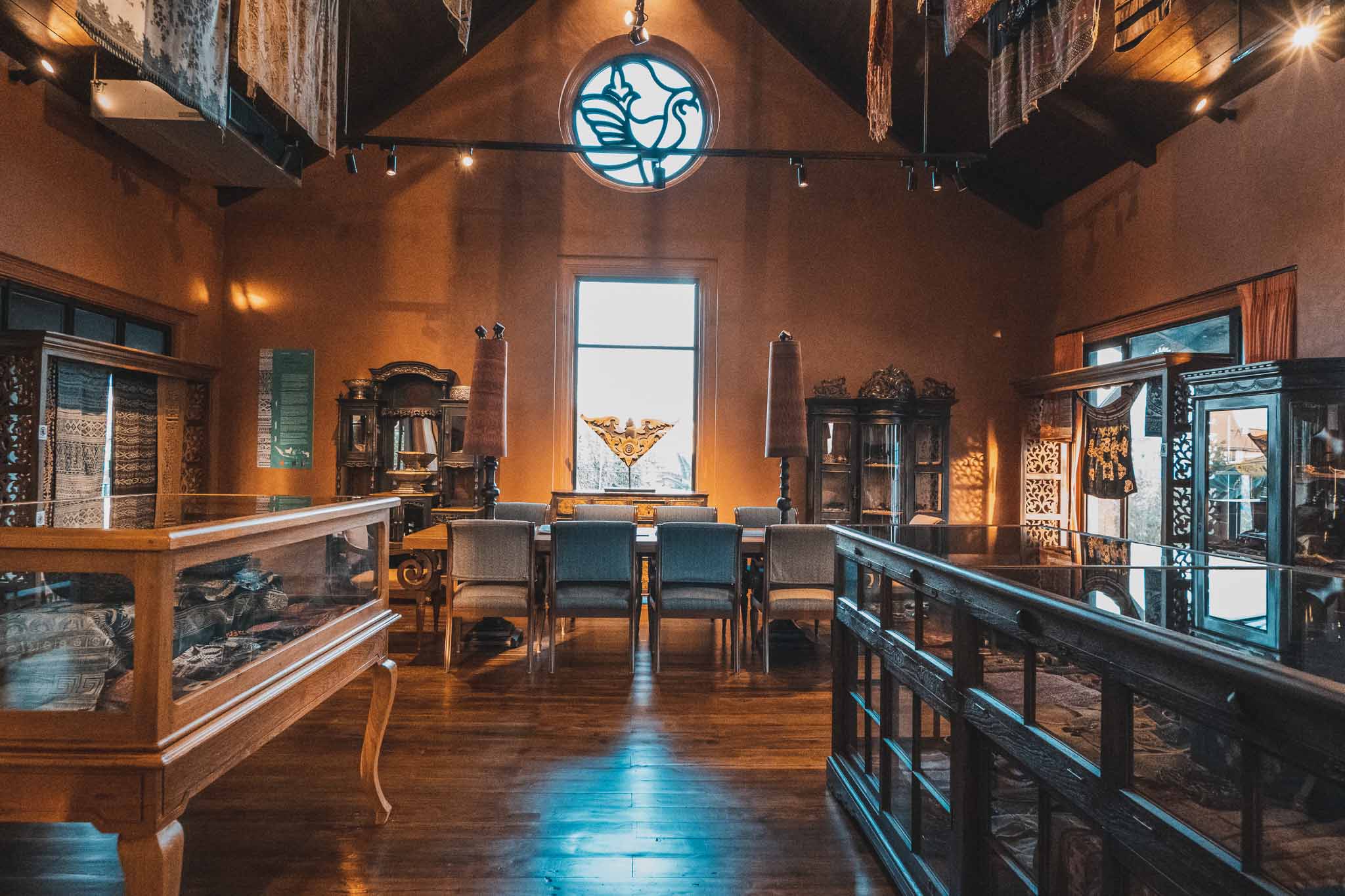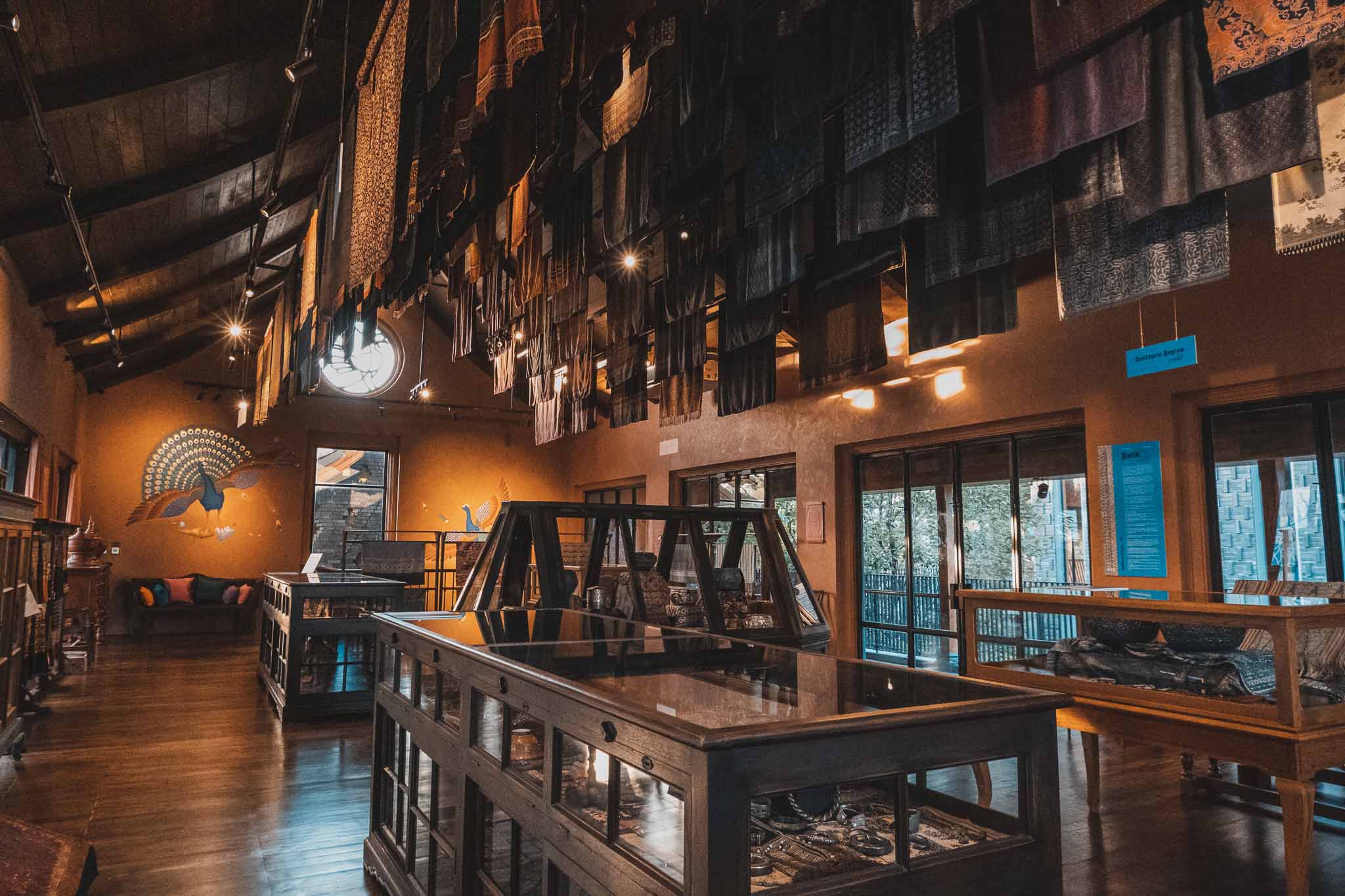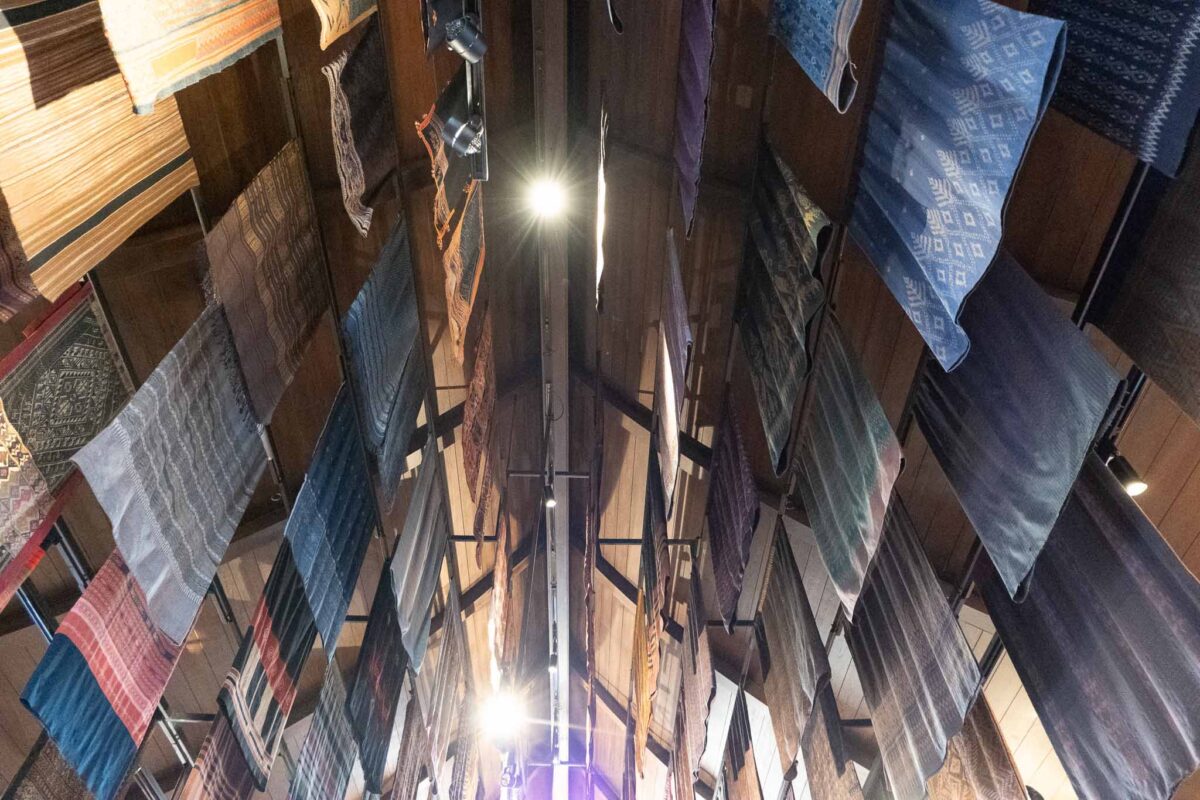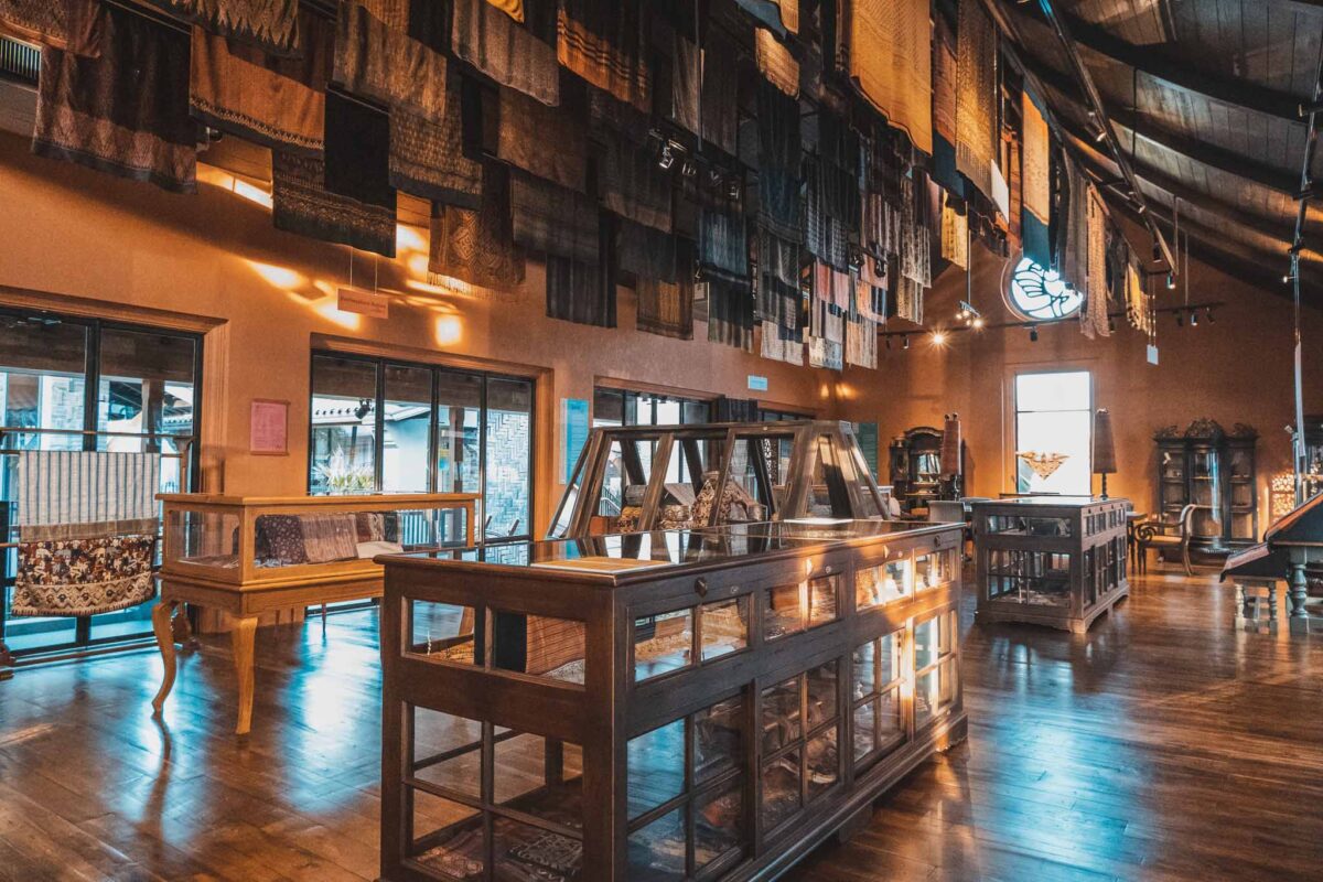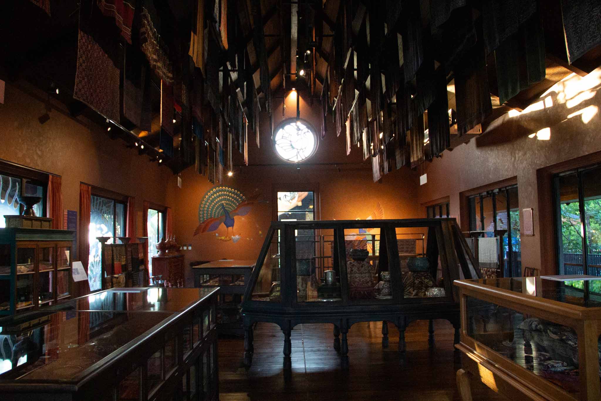 บริเวณตรงกลางอาคารชั้นบนสุดจะทำเป็นหลังคาที่โชว์โครงสร้างของสถาปัตยกรรมล้านนาแบบดั้งเดิม นอกจากนี้นิทรรศการที่พลาดไม่ได้ของเขา ก็คือ นิทรรศการผ้า ซึ่งเป็นของสะสมส่วนตัวของเจ้าของที่นี้ มีผ้าจากหลากหลายที่ให้ชม จัดแสดงอย่างสวยงาม บอกเลยว่าใครชอบงานผ้าต้องลองมาที่นี้ซักครั้ง ❤️